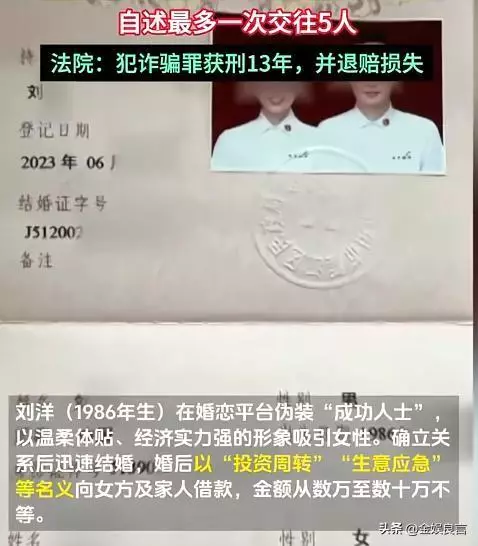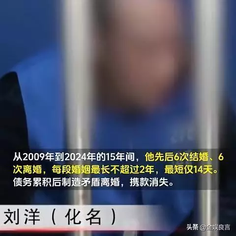 四川一名39歲劉姓男子,在15年間先後結婚6次、離婚6次,每段婚姻持續時間都很短,最長的不超過2年,他假扮富豪,常以做生意需要資金爲由借錢。