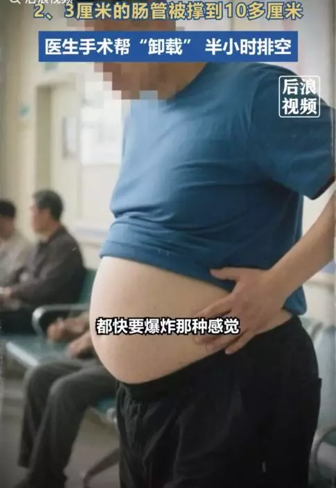 男子長期便秘腹部腫脹似懷胎八月,經手術排出20KG糞便。影片截圖