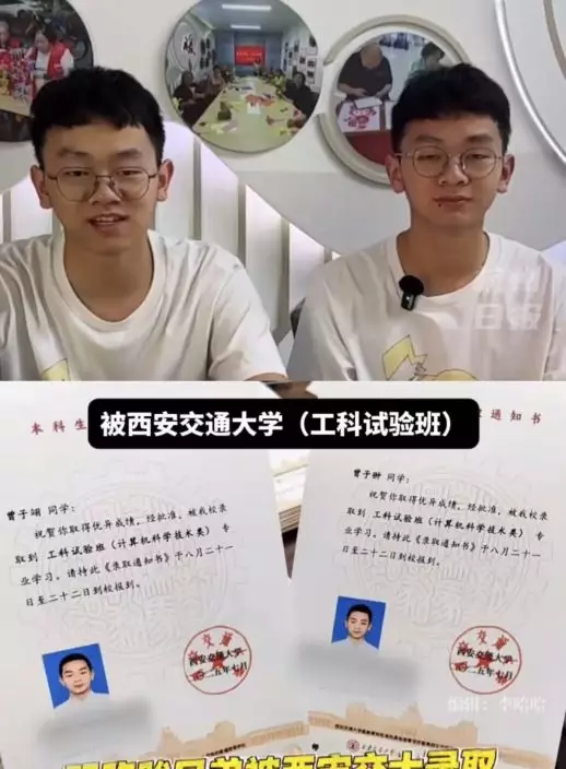 西安交通大學於7月25日在官方平台發文表示,「來自浙江的雙胞胎兄弟以666分同分佳績,雙雙考入西安交大同一專業!這份神同步的優秀,是緣分更是實力。未來,期待這對兄弟在交大並肩逐夢,綻放更多光彩!我們在興慶宮旁、渭水之畔等你們」。