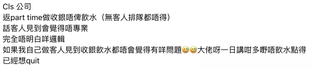 事主在社交平台大吐苦水,表示公司以「保持專業」為由,禁止收銀員在工作期間飲水。他無奈表示:「大佬呀,一日講咁多嘢唔飲水點得?」更透露已萌生辭職念頭。