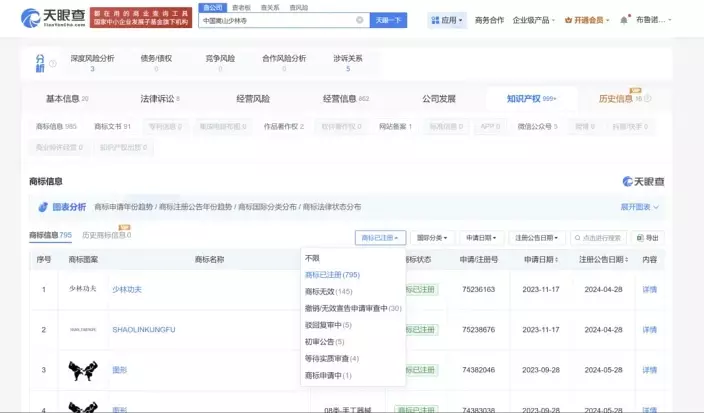 據內媒透過天眼查數據顯示,截至7月27日,中國嵩山少林寺已註冊的商標達795個,涉及珠寶、教育娛樂、服裝鞋帽、方便食品、燈具、餐飲住宿等各型生意。