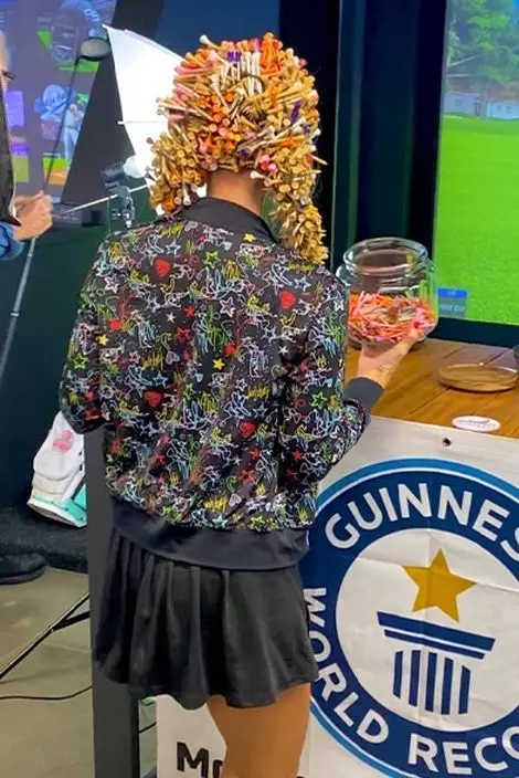 美國加州一名熱愛哥爾夫球的女子,將711個球釘插在頭髮上,打破了一項不尋常的健力士世界紀錄。