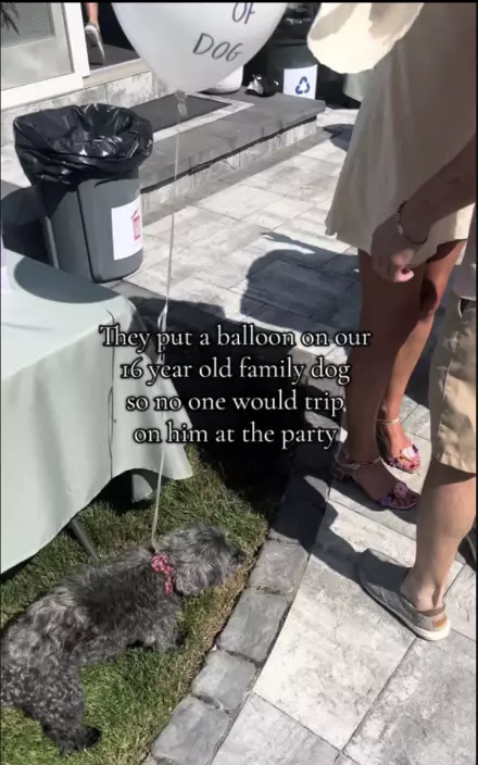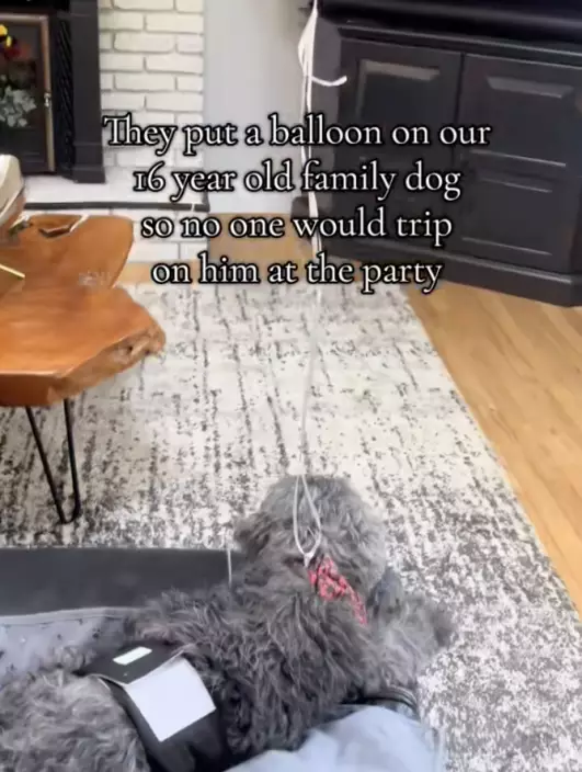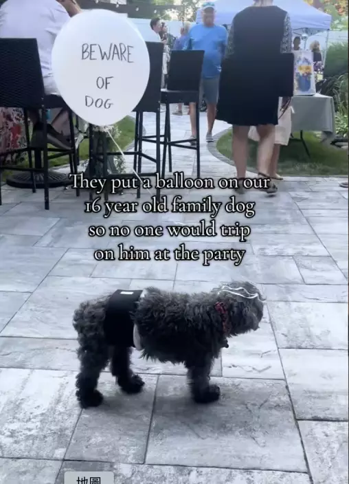 飼主在16歲約克夏犬身上綁氣球標示位置以防參加聚會被人踩到。影片截圖