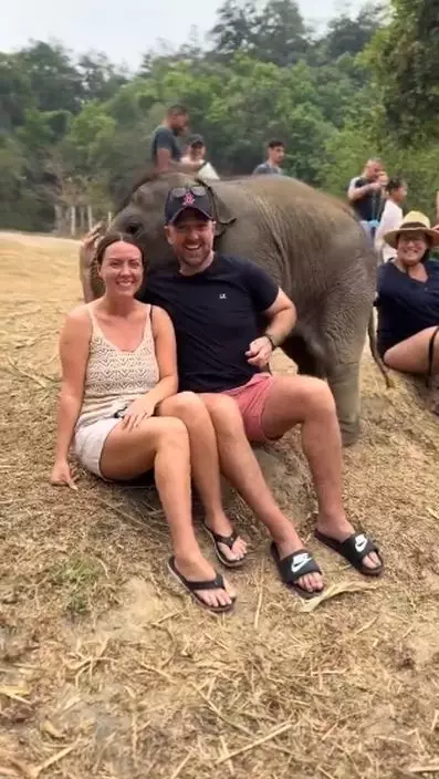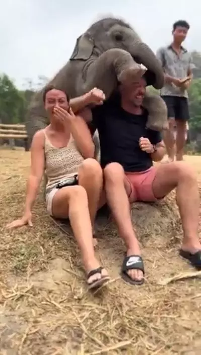 這隻逗人喜愛的小象意猶未盡,雙腳有所動作,踏上男子的肩膀,像孩子般要求孭一孭。對方相信沒有想到有這種遭遇,一直只在大笑。影片配文稱:「小象覺得人類很可愛,想要擁抱我們」。