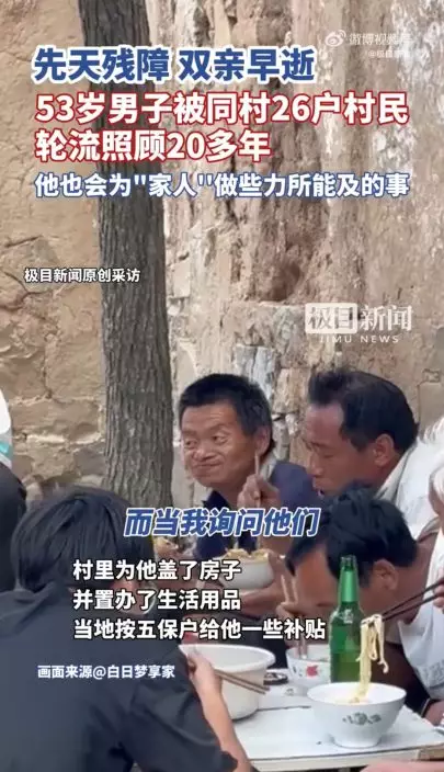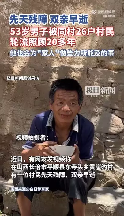山西聾啞男子自幼失去雙親且患智力障礙生活無法自理,過去20年來依靠26戶村民輪流照顧起居,無血緣卻勝似親人。