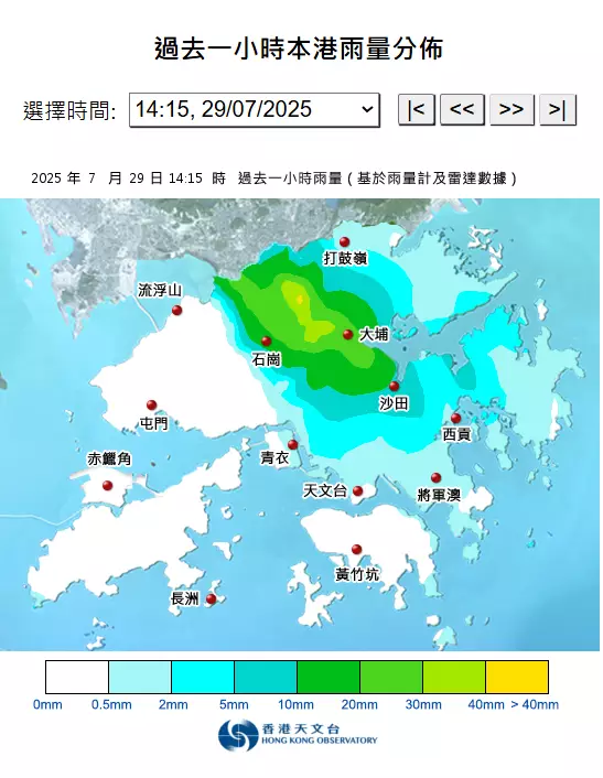 天文台提醒,新界北部,尤其上水一帶,正受大雨影響。天文台網頁截圖