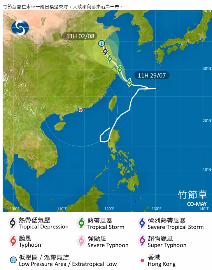 熱帶風暴「竹節草」在正午12時,集結在溫州以東約370公里,預料向西北移動,時速約15公里,橫過東海,大致移向華東沿岸一帶。
