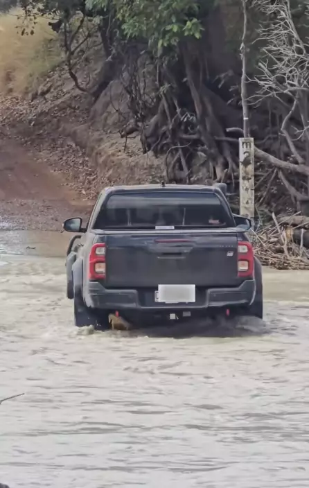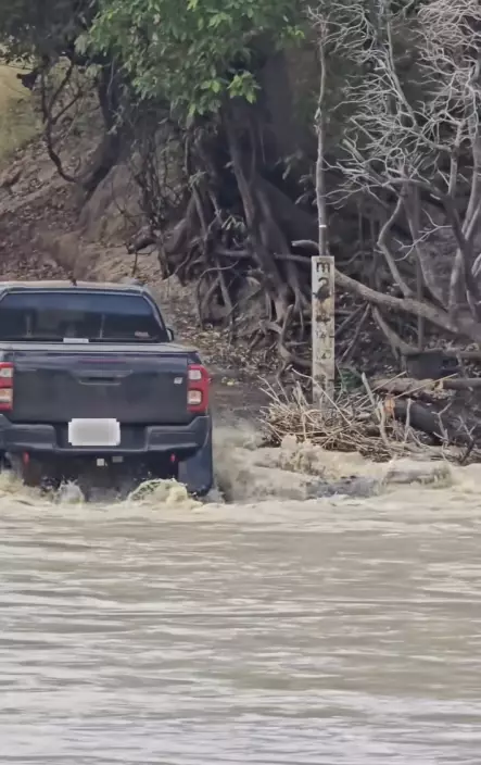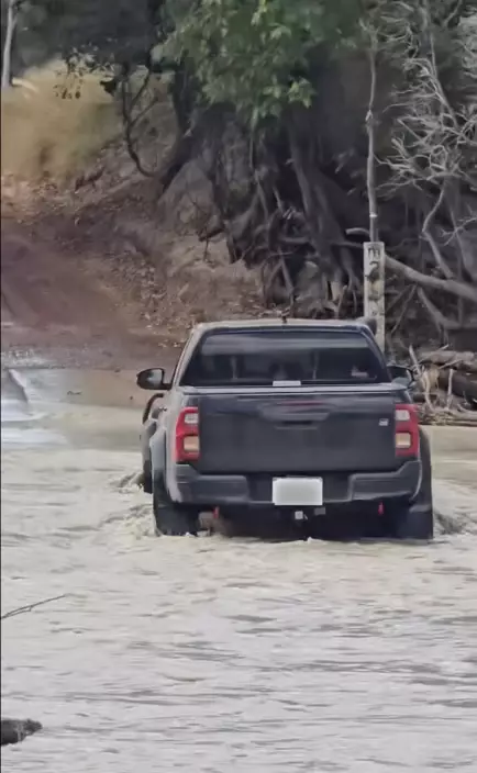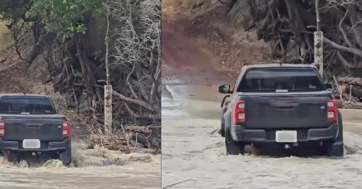 澳洲一名男子駕駛小貨車準備渡過淹水街道時突遭鱷魚爬出卡住車輪,遂緊急倒退助牠脫困,驚險畫面曝光!