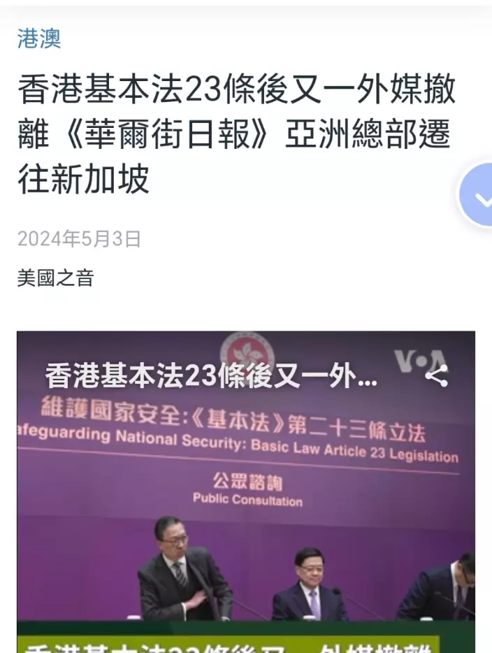 去年5月,《華爾街日報》(WSJ)向員工發布的內部通知,稱其亞洲總部將從香港遷至新加坡。這是繼美國《自由亞洲電台》之後,又一外媒決定撤離香港。《美國之音》當時聲稱,香港新聞自由與言論自由環境持續惡化。