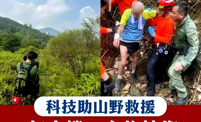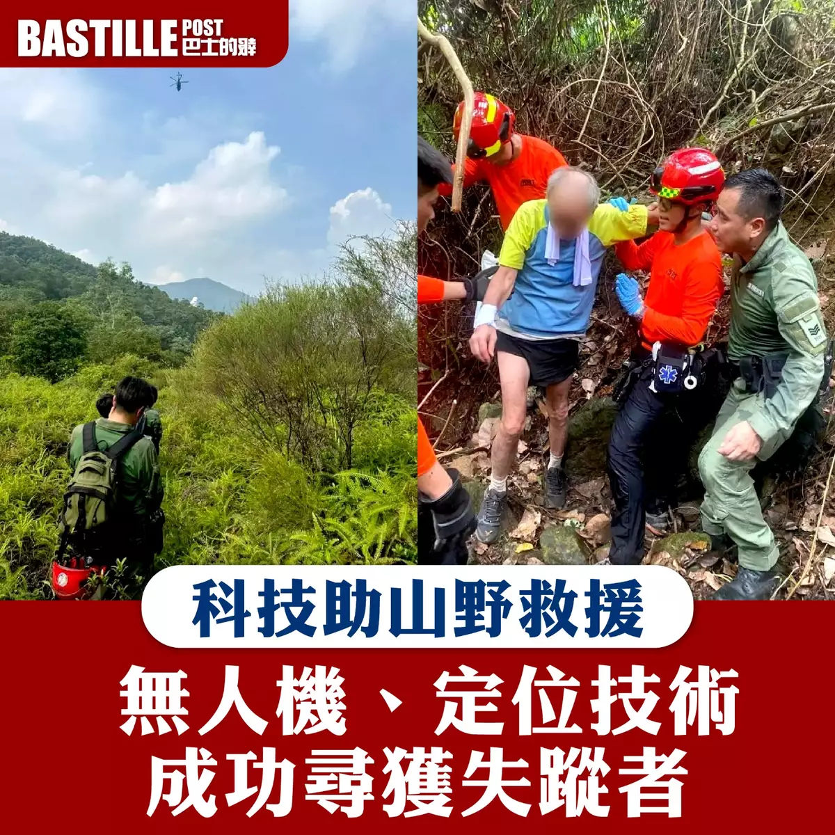 警方聯同消防處、民安隊及政府飛行服務隊的搜救團隊,結合無人機和先進手機定位科技,成功尋獲72歲受傷被困的失蹤行山老翁。