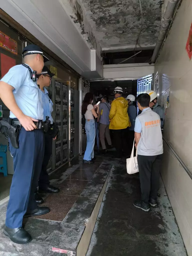 觀塘仁安大廈,部分樓層單位停電,約100戶受影響,關愛隊在大廈外設支援站,協助有需要居民。