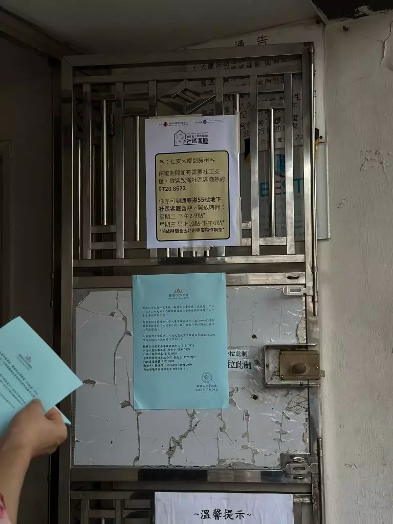 有團體張貼告示,呼籲大廈劏房租客如需要支援,可致電附近社區客廳熱線,又建議如有需要可到社區客廳暫避。社區客廳主管李小姐說,下午開始大約有20名居民到場,主要是用膳、洗澡和為電話充電,晚上也有居民因家中停電無冷氣和感到不安全,在社區客廳逗留過夜。