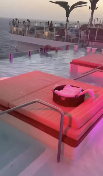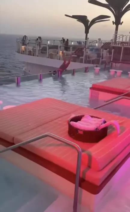 郵輪乘客墮無邊際泳池外圍,所幸並無大礙。影片截圖