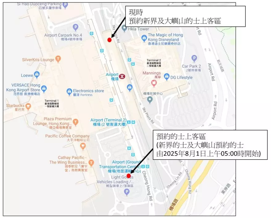 運輸署表示,由8月1日上午5時起,已預約乘坐的士的人士,需要前往機場一號停車場旁邊之「預約的士上客區」上車。機場抵港大堂內會加設指示牌,方便找尋相關位置。