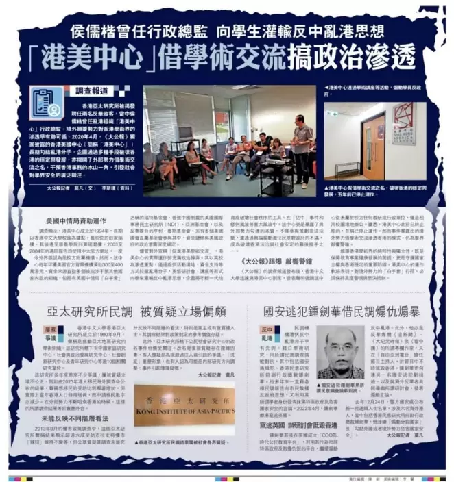 《大公報》近日連番揭露不同機構軟對抗的事件,最新報道提到中大香港亞太研究所最近關於特區政府的民意調查結果,與其他媒體同類調查相去甚遠,引起社會爭議。《大公報》調查報道揭露,原來亞太研究所聘任了2名譽高級研究員,包括曾任「香港美國中心」(港美中心)行政總監的侯儒楷(Morton Holbrook)及「台獨」學者蕭新煌。中文大學發言人其後回覆《大公報》指,該研究所將中止兩人的聘約,並嚴格遵守《香港國安法》。