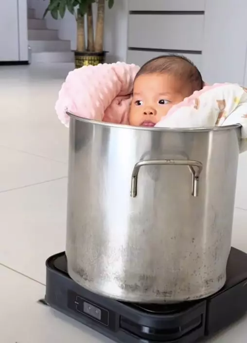 新手爸爸用棉被將孩子包裹放入大型湯鍋內並固定於掃地機械人上。影片截圖
