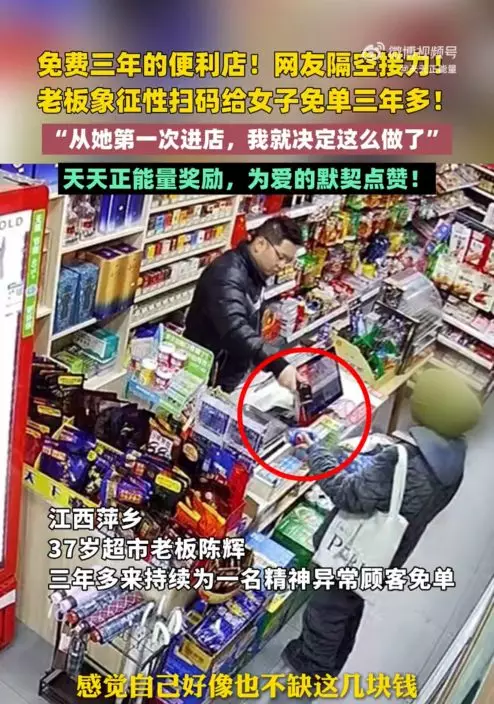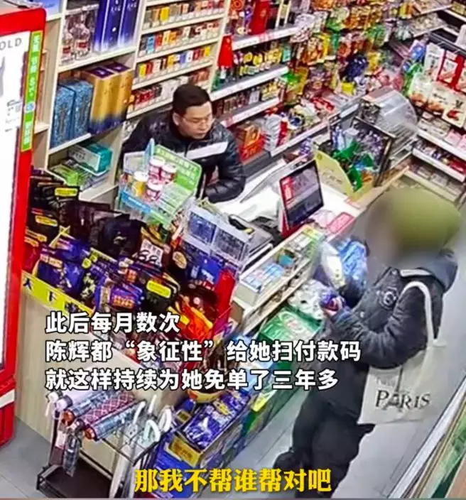 後來,陳輝意外得知女子因遭遇變故導致精神狀況出現異常,於是每當對方到店買東西時,他都象徵性掃描商品條碼,但卻未收取分文,並配合對方「等有錢再還」的承諾,默默為對方免單逾3年。