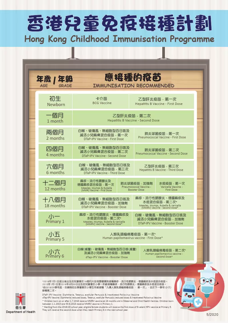 衞生署衞生防護中心轄下的「疫苗可預防疾病科學委員會」從公共衞生的角度就「香港兒童免疫接種計劃」提出建議,而母嬰健康院是按照「香港兒童免疫接種計劃」為初生至五歲的嬰幼兒童提供免疫接種服務。小學學童則由衞生署轄下的學童免疫注射小組到學校提供接種服務。