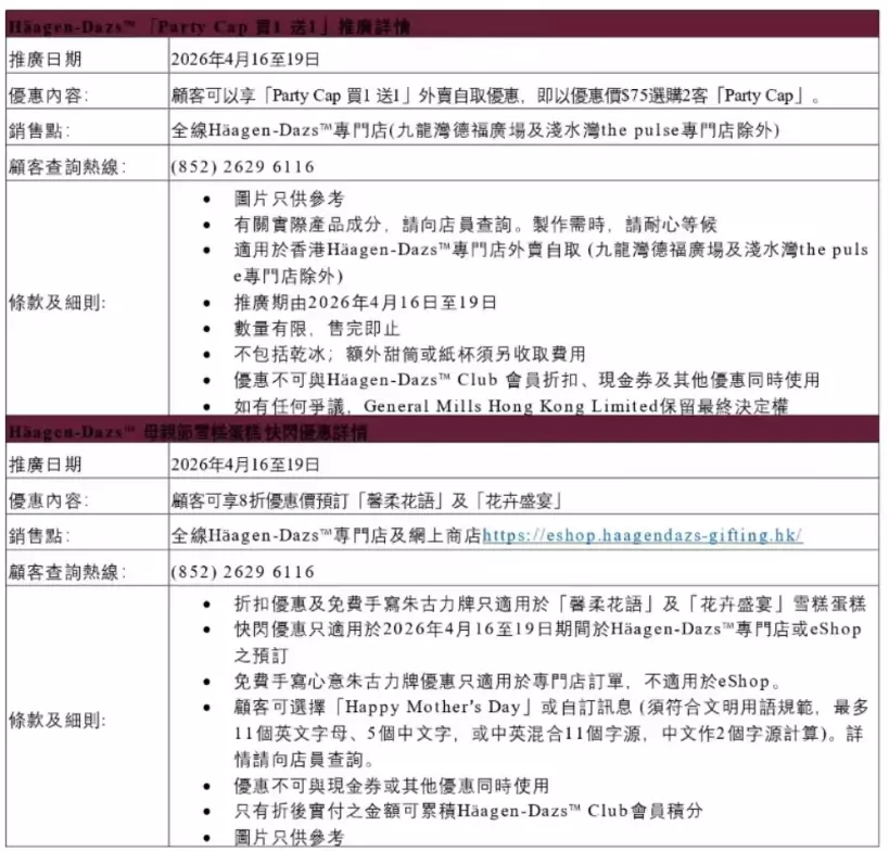 Häagen-Dazs™ 推「Share the Love」限時驚喜,經典 Party Cap買一送一 ,兩款母親節蛋糕預訂尊享八折優惠。