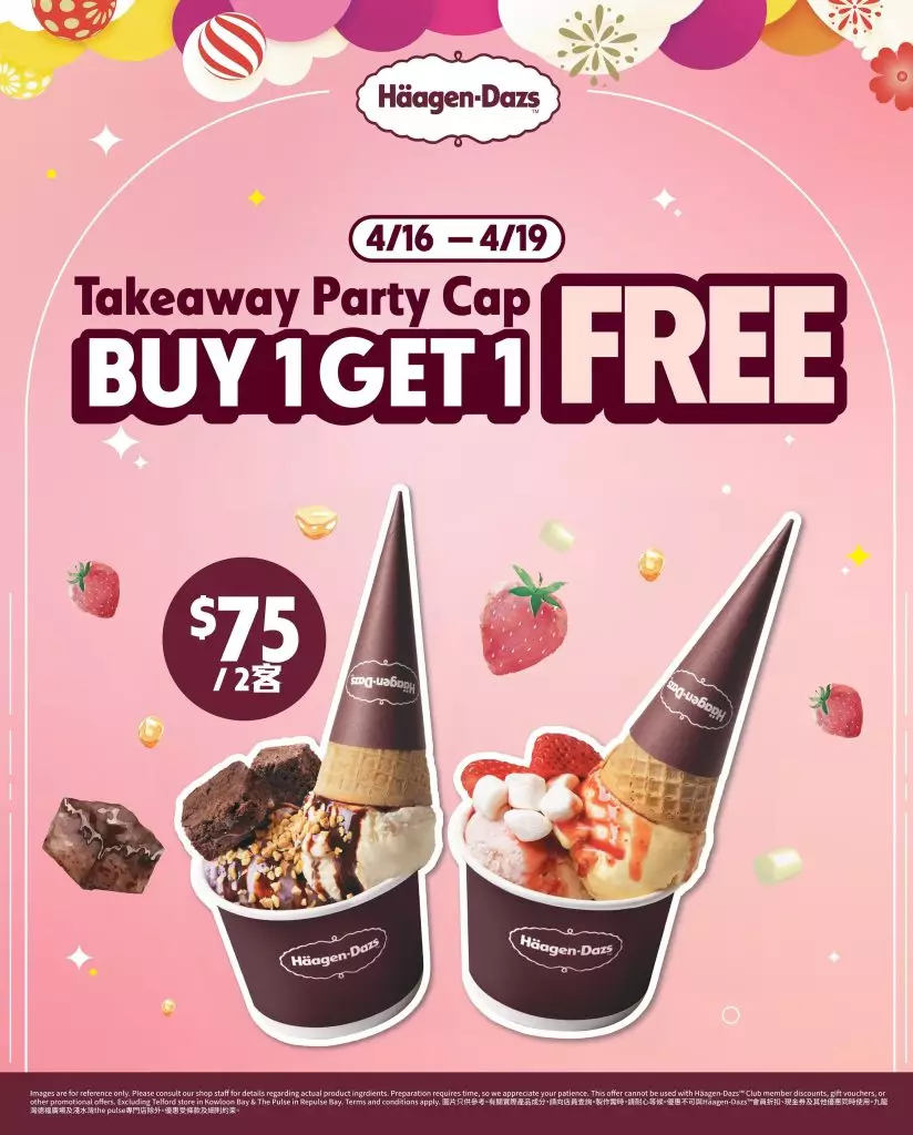 天氣回暖,最適合享用一杯雪糕滋潤心情!Häagen-Dazs™專門店經典 Party Cap買1送1優惠驚喜回歸(HK$75兩客,平均HK$37.5/客),顧客可自選雙球雪糕,再加上酸甜水果、軟糯布朗尼或香甜棉花糖等指定配料,層次豐富,口感滿分!立刻把握限時優惠,同摯愛好友分享甜蜜!