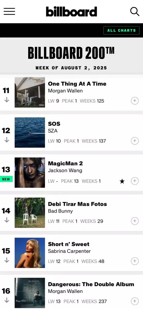 王嘉爾(Jackson)全新專輯《MAGICMAN 2》在發行首周衝擊《Billboard 200專輯榜》榮登第13位,創下中國華人歌手首發專輯在該榜單上的歷史新高。這次他還打破個人紀錄 ,新作除了比2022年推出的《MAGICMAN》首發佔據《Billboard 200專輯榜》 第15位上升兩級之外,王嘉爾更成為連續兩張個人專輯均打入 《Billboard 200專輯榜》 Top 15的中國華人歌手第一人。