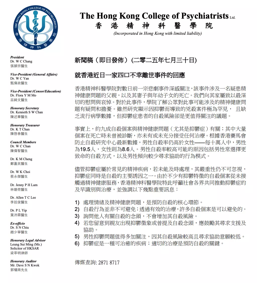 荃灣日前發生謀殺及自殺案。香港精神科醫學院表示深感關注,向家屬致以最深切慰問和哀悼。