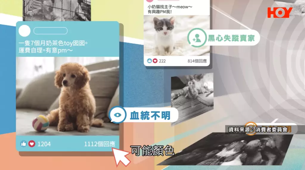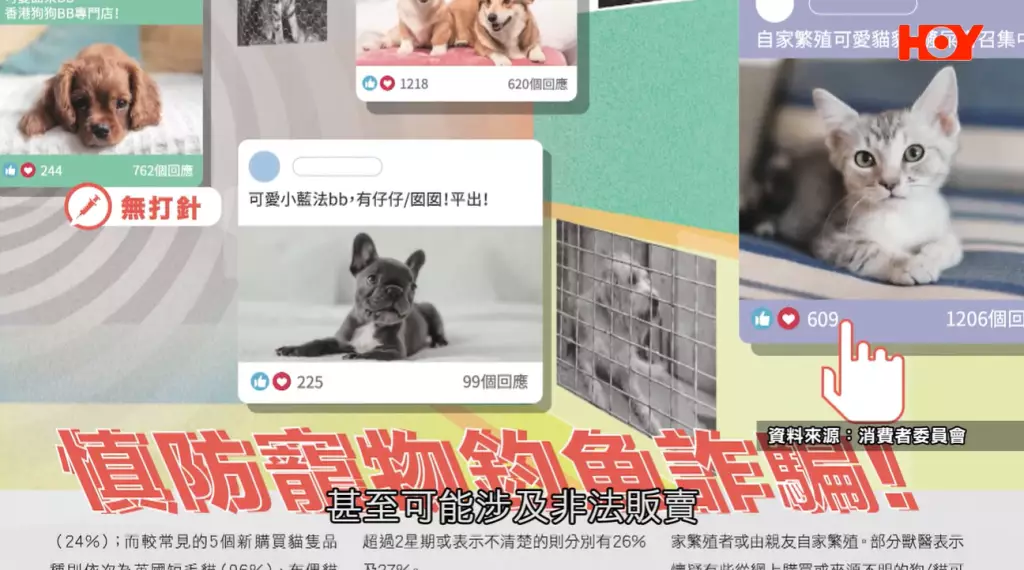 據《一線搜查》了解,近年不少社交平台出現疑似出售聲稱自家繁殖貓狗的貼文,並且經常以可愛的貓狗照片及影片吸引買家,然後貓狗來源卻成疑,甚至可能涉及非法販賣。消委會表示,有不法商人會用可愛照片誘使人觀看並詢問交易,但很多時候照片及資訊都不是真確,買了回來可能顏色、品種、身體狀況都會出現問題,而且出生地都可能是不實聲明。