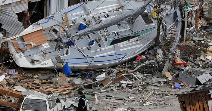 一名男子在日本岩手縣大船渡市的受海嘯影響區域附近行走,旁邊是一艘擱淺的遊艇,照片拍攝於2011年3月15日,即災難發生後第四天。(AP資料圖片)