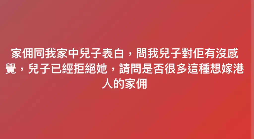 該名僱主在Facebook群組「聘請工人姐姐關注組」發帖,表示家中外傭突然向其14歲兒子表白,兒子當場拒絕。事主感到震驚之餘,亦好奇詢問網民:「請問係咪好多呢種想嫁畀港人嘅家傭?」