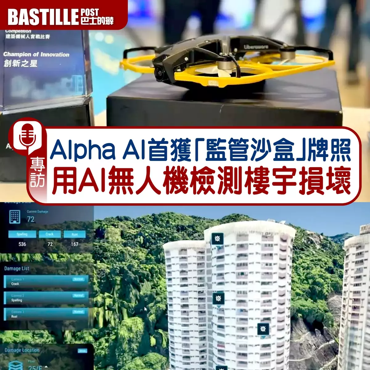 政府積極推動「低空經濟」發展,作為數碼港培育的初創企業Alpha AI成為本港首間獲批「監管沙盒」牌照的公司,其聯合創始人兼行政總裁何進一(Desmond)接受《巴士的報》專訪時指出,AI配合無人機,能精準識別建築外牆缺陷,如裂縫、石屎剝落等樓宇老化問題,還可構建3D可視化模型,直觀呈現建築損傷情況;連假天花、電梯槽等密閉空間也不放過,巴掌大小的小型無人機更能穿透各種安全隱患。惟他坦言,本港高樓林立,令無人機定位存在不穩,故正與衛星公司合作在地面安裝訊號增強器,以提升定位精確度。