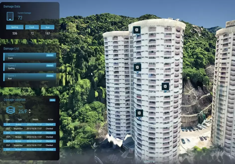為此,Alpha AI將AI與無人機結合,開發出無人機智能檢測方案。AI技術能精準識別建築外牆缺陷,如裂縫、石屎剝落等問題,還能自動評估其損壞程度。Desmond解釋,AI還可以構建3D可視化模型(3D dashboard),直觀呈現建築損傷情況,使維護人員能夠更清晰地掌握建築狀況。