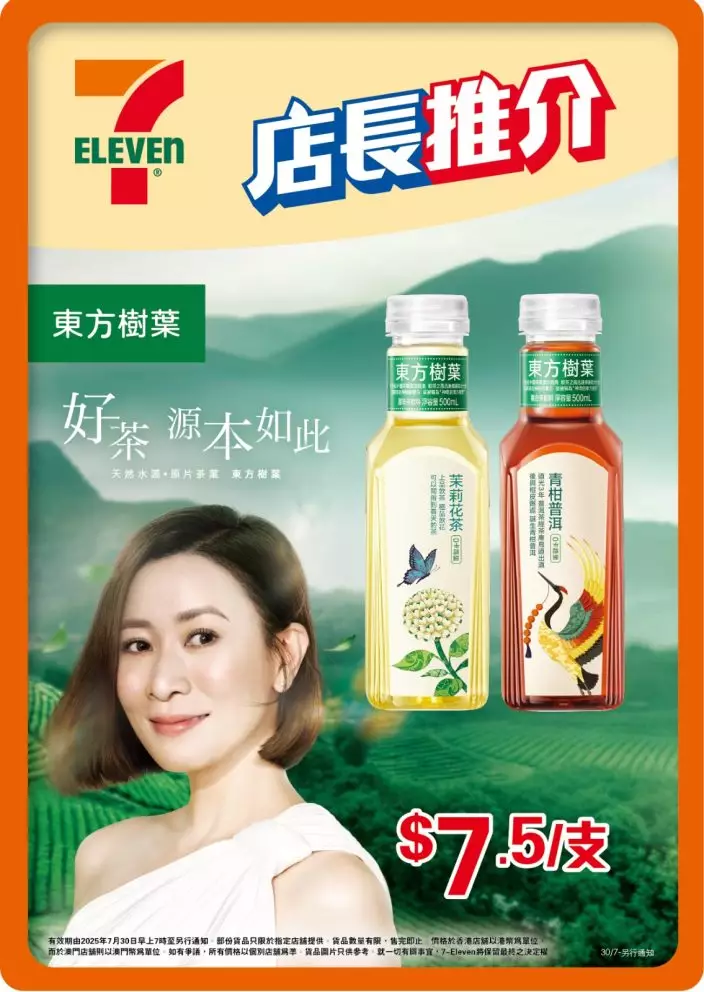 東方樹葉一直堅持提供「0糖、0卡、0脂、0添加香精、0添加防腐劑」的優質無糖茶,深受追求健康生活的消費者喜愛,最近更邀得視后佘詩曼擔任品牌代言人,以其對演技的極致追求,完美詮釋東方樹葉對品質的堅持,令坊間掀起東方樹葉搶購潮,在便利店更是「一茶難求」!為答謝廣大市民支持,東方樹葉於即日起至8月26日推出限定優惠,在7-Eleven便利店推出「店長推介」,以每支$7.5的震撼價,超值發售視后私心推介的茉莉花茶及青柑普洱茶,為炎夏降溫,清爽解膩!