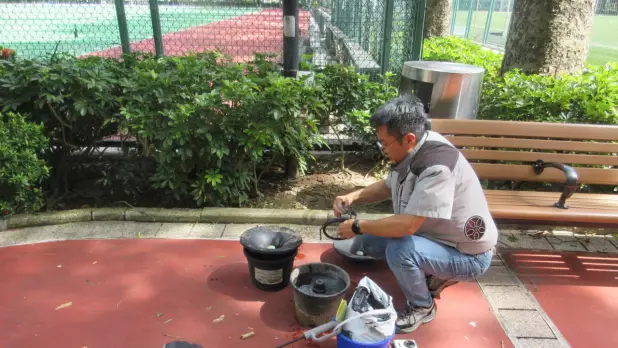 工作人員放置蚊子誘捕器和滅蚊機等防蚊及滅蚊設置。(政府新聞處)