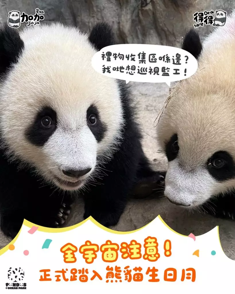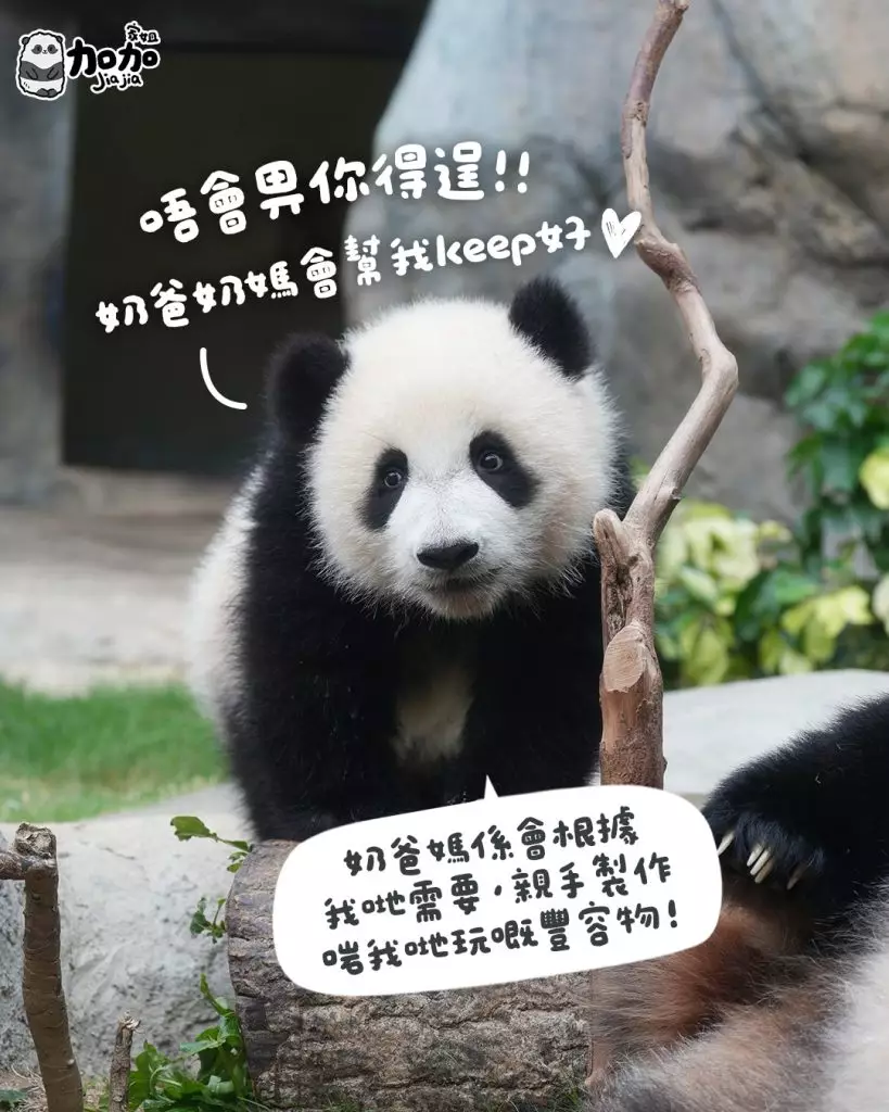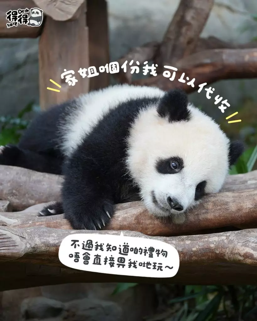 園方又化身家姐「加加」和細佬「得得」的代言人,指「禮物唔會直接畀我哋玩㗎~因為奶爸媽係會根據我哋需要,親手製作啱我哋玩嘅豐容物!」不過這些來自熊貓粉絲的禮物,有機會變成園內展示的打卡位,見證家姐「加加」和細佬「得得」的成長!