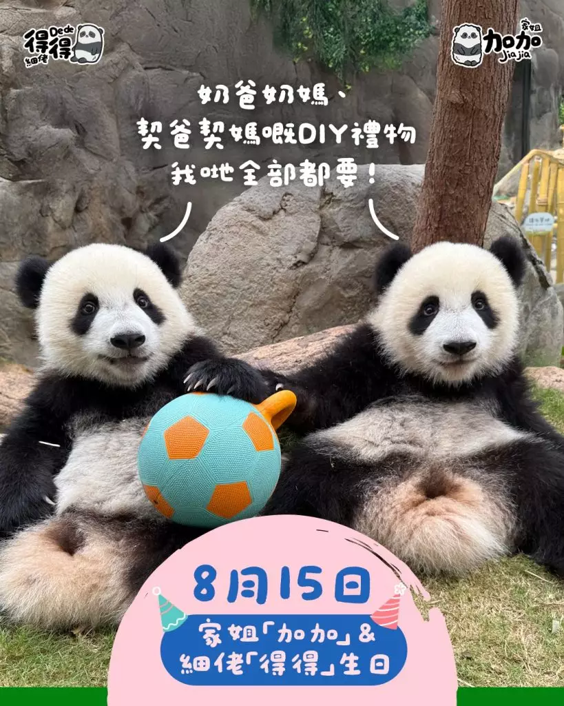 海洋公園於8月1日在社交平台撰文指,「四位壽星都準備好收禮啦~一齊嚟陪佢哋過一個超有愛嘅生日月啦!」,原來除了家姐「加加」和細佬「得得」是8月之子,就連爸爸「樂樂」同媽媽「盈盈」亦都是8月出生,其中「盈盈」和「樂樂」生日分別為8月16日及8月8日,兩人都是於2005年出生,一家四口都在8月來到呢個世界,果然緣分天註定!