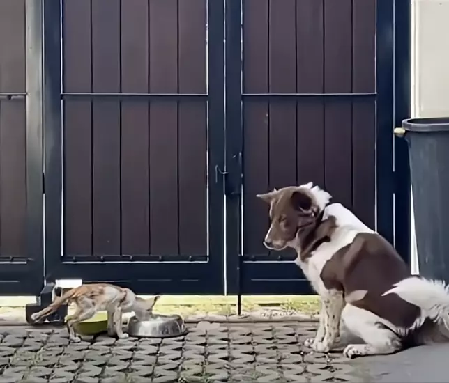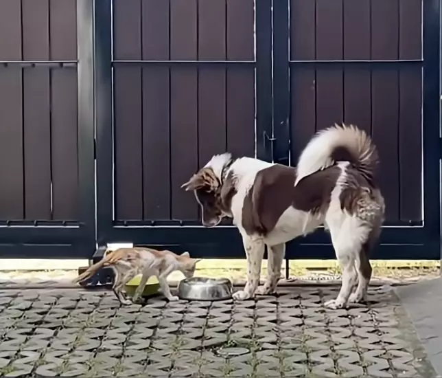 當時屋主家的狗狗當時正準備開飯,沒想到看見這位可憐的小客人後,竟沒有吠叫、沒有驅趕。而是默默地把自己的食物讓了出來。甚至主動後退幾步,彷彿在說「你慢慢吃吧,別介意我在這」。