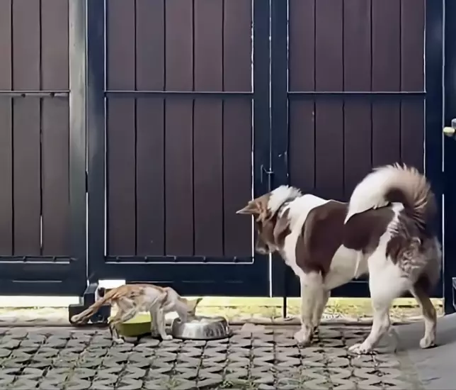屋主見狀感動不已,拍下這段畫面分享到社交平台,瞬間引起熱烈迴響。網民紛紛表示「狗狗好善良」、「這隻狗太棒了太讚了!小猫咪遇到了貴狗了」、「浪貓十分瘦弱,有幸善良的狗狗讓牠吃」。