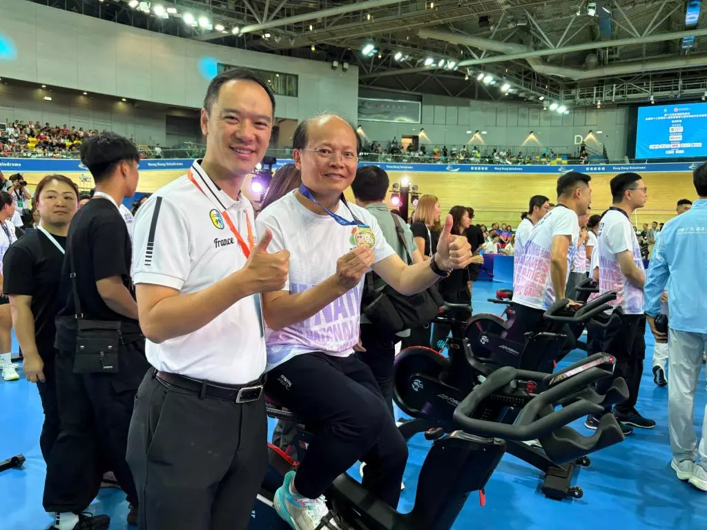 中華電力總裁羅嘉進(左)為代表中電參與「全運 100 全民共創百萬公里大挑戰」的最後 100 公里衝刺的客戶成功及銷售總監盧志華博士(右)打氣。