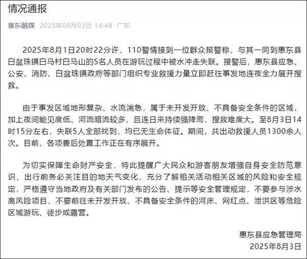 廣東惠東縣應急管理局表示,前晚接報5人到白馬村白馬山遊玩期間被水沖走失聯,截至星期日下午,5人已經全部找回,均已罹難。