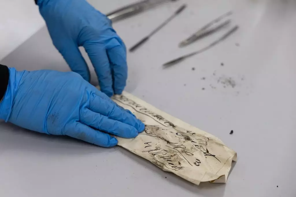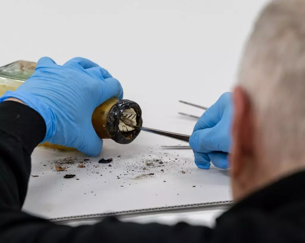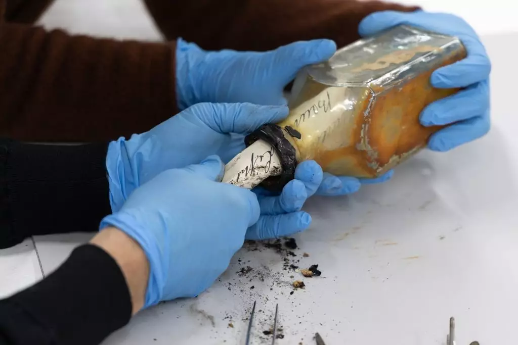 由於這個瓶子是用塗有瀝青的軟木塞密封的,所以要取出瓶子中的信紙有很大的難度。他們先小心翼翼地把軟木塞頂部的瀝青去掉,再把軟木塞從瓶子上取下來,然後慢慢地把裡面的信紙在不受損的情況下經由狹窄的瓶頸取出來。這又是另一個挑戰。