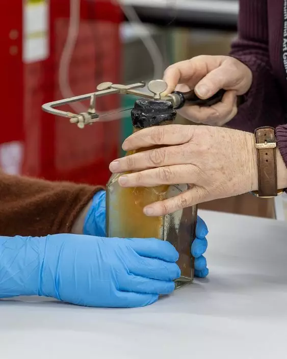 這個瓶子後來轉交給塔斯馬尼亞博物館和美術館 (Tasmanian Museum and Art Gallery),由該館的文物保護員貝瑞 (Michelle Berry) 在其實驗室內進行開瓶儀式。