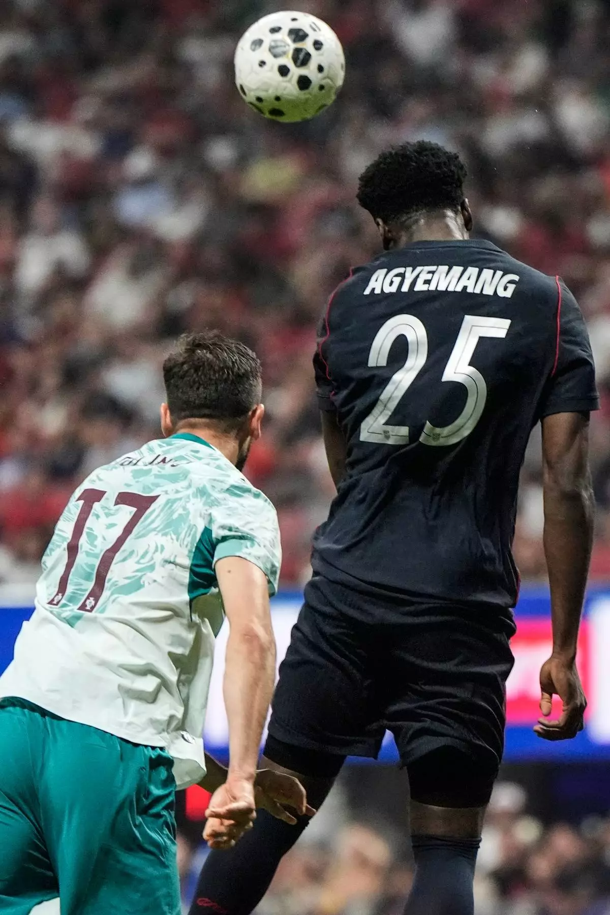 美國的柏德烈艾耶文(25號)在2026年3月31日周二於阿特蘭大舉行的一場國際足球友誼賽下半場,與葡萄牙的保連奴(17號)對抗。(美聯社圖片/米克史超活) AP圖片