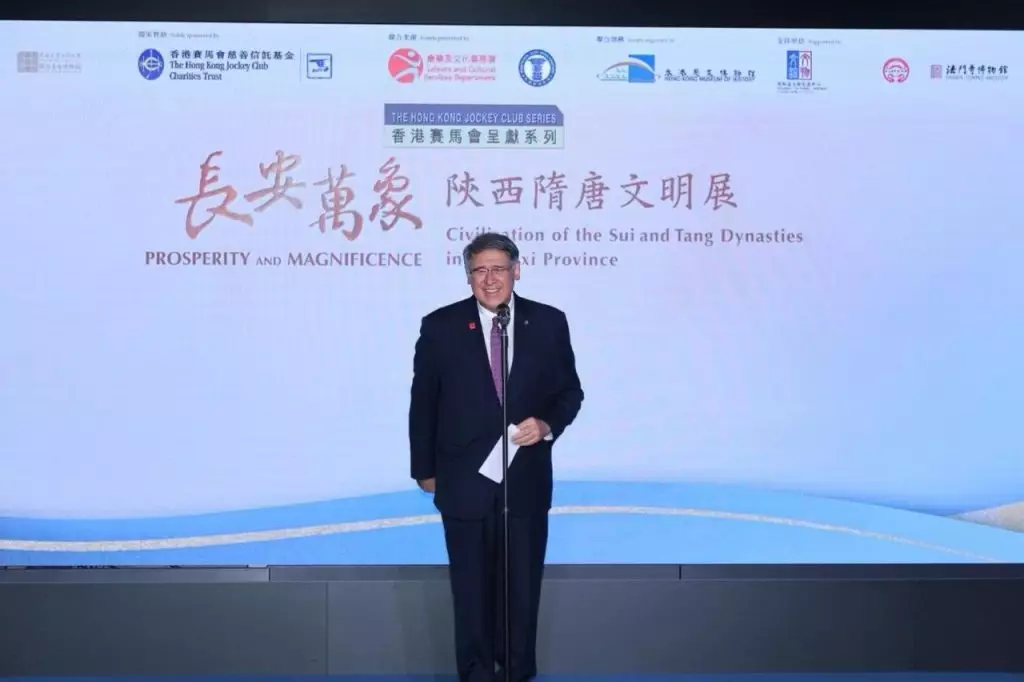 文化體育及旅遊局局長羅淑佩(右四)、外交部駐港特派員公署副特派員花有(左四)、陝西省文物局副局長王潤錄(右三)、中聯辦宣傳文體部副部長林枬(右二)、香港賽馬會主席副黃嘉純(左三)、「憲法和基本法推廣督導委員會」轄下「愛國主義教育工作小組」委員彭韻僖(左二)、署理康樂及文化事務署署長譚美兒(右一)以及香港歷史博物館總館長何惠儀(左一)一同主持「香港賽馬會呈獻系列:長安萬象 — 陝西隋唐文明展」開幕典禮。