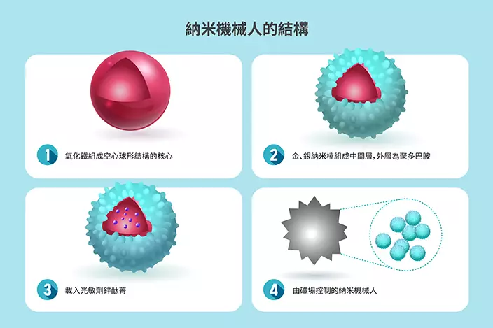 由氧化鐵組成的核心:氧化鐵屬磁性材料,讓納米機械人能夠透過磁場控制,按照既定的路徑移動。