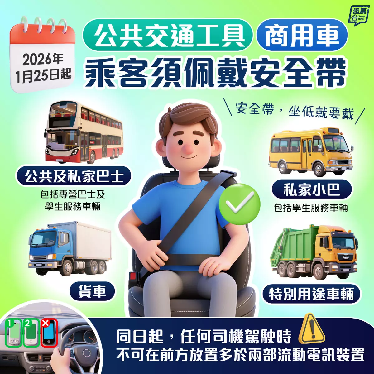 安全帶新修訂規例生效。運輸署FB圖片