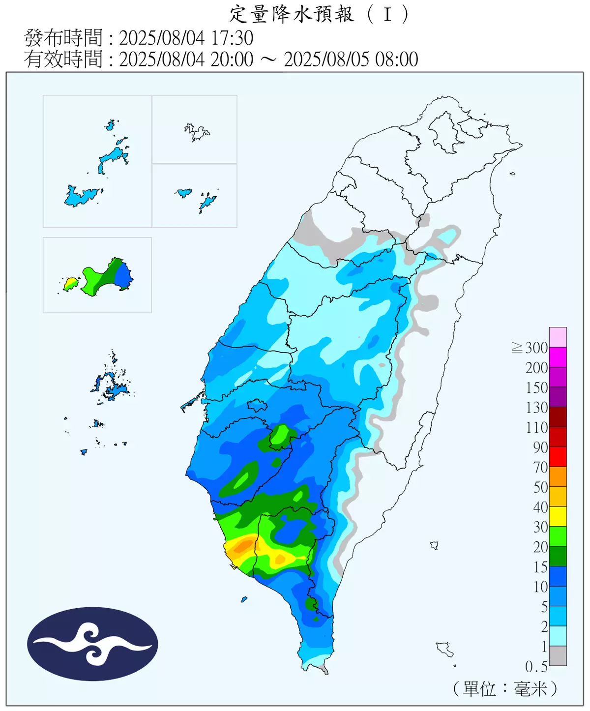 台氣象部門預計,今日中南部仍然不排除有大暴雨。因應強降雨,高雄、台南、嘉義縣、南投縣及屏東縣等縣市多地區今日停工停課。