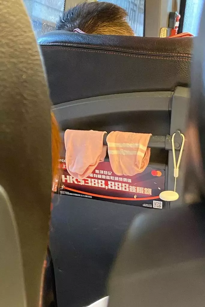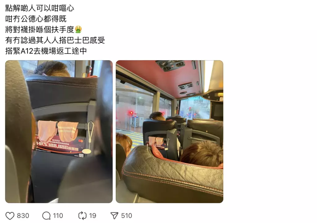 事發於城巴機場快線A12線(小西灣藍灣半島往機場),目擊者在早上10時許在Threads發帖,表示上班途中目睹奇景!照片可見,一對明顯濕透的粉紅色襪子被掛在前座椅背扶手,襪筒還特意展開以加快「風乾」效果。