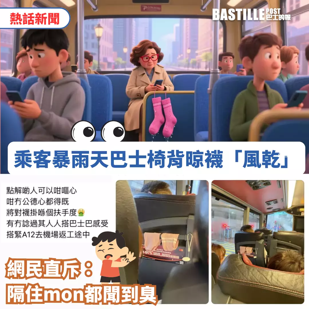 本港連場暴雨令不少市民狼狽不堪,有巴士乘客就目擊同車乘客竟將濕透的粉紅色襪子掛在前座椅背扶手上「風乾」,隨即拍下照片在社交平台發文怒斥:「點解啲人可以咁嘔心?」