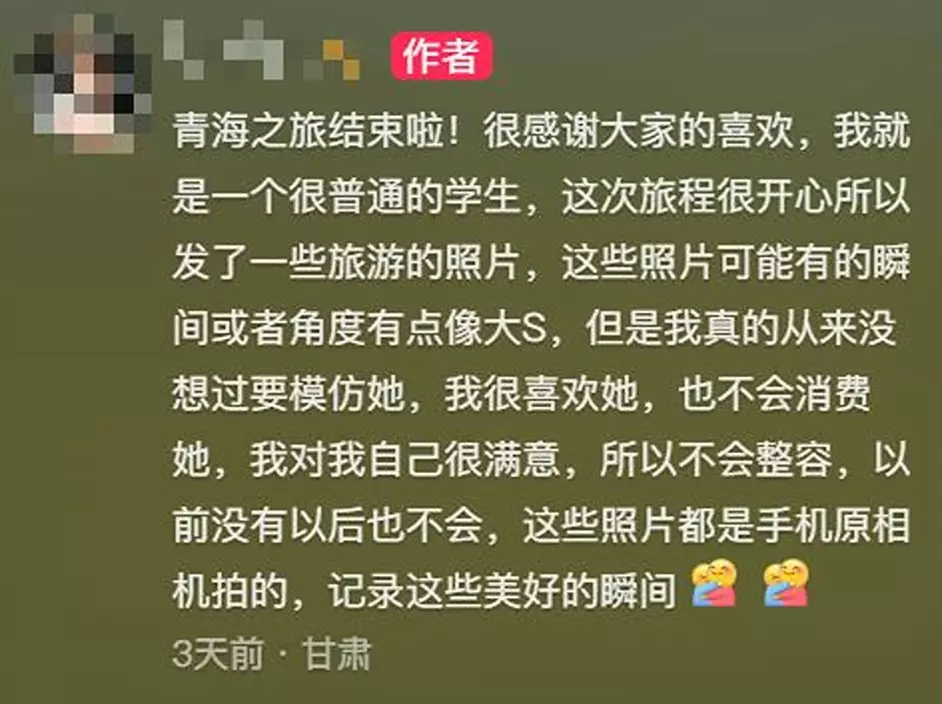 她其後於7月31日發文回應,感謝大家的喜愛,並澄清:「我只是一名普通學生,所有照片均由手機原相機拍攝,某些瞬間或角度可能有點相似大S,但我從來沒有模仿她的打算。」