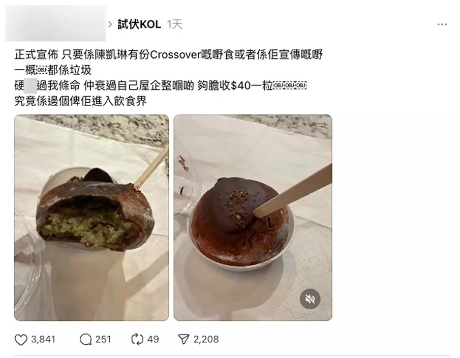 Grace自家朱古力品牌早前與本地老字號餅店聯乘,推出4款口味嘅朱古力大福,聲稱係「全港最好食嘅朱古力大福」。佢更親自落場拍片宣傳,剪開大福大賣「拉絲」軟糯感,不過就有網民食完即爆炸,喺Threads發文開火,狠批:「只要係陳凱琳Crossover嘅嘢,全部都係垃圾!」更直斥大福「硬過命」、「無爆漿、無拉絲」,仲貼片證實,用木棍戳落去都唔入!